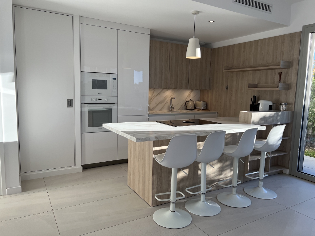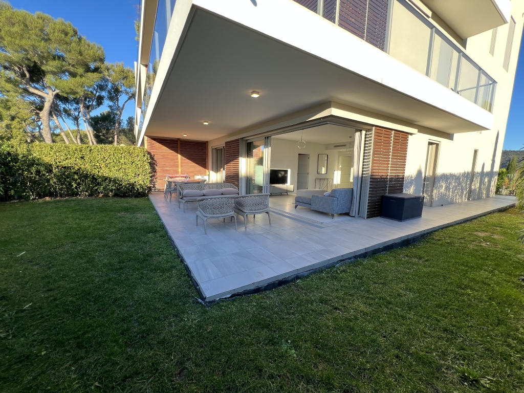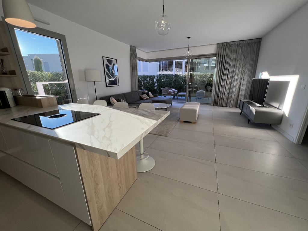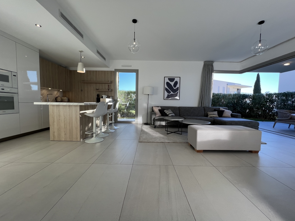 Une entrée, un séjour avec une cuisine américaine entièrement équipée de 38m² (mobilier, réfrigérateur, plaques de cuisson, hotte aspirante, four, four micro-ondes, lave-linge et lave-vaisselle), une suite parentale de 21m² (chambre, dressing, salle de bains, douche et WC), deux chambres de 10.2m² ouvrant en nord sur un jardin, une salle de douche et un WC séparé. Chaque chambre est équipée de placards de rangements aménagés. Le séjour et la suite ouvrent en sud sur une terrasse couverte et un jardin.